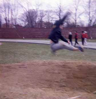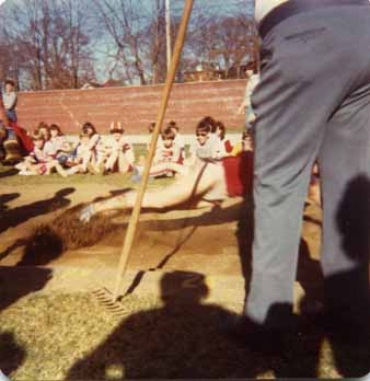 I put everything into the first jump, shown again in slow speed. The last two were shorter, and I did not qualify for the finals, finishing tied for 10th(?). On the first jump, I achieved such great vertical mid air height I partially panicked and dropped my legs prematurely, which shortened the jump distance. The better technique would have been to advance from the 1.5 hitch kick to the 2.5 hitch kick used by jumpers achieving greater lengths, but since I'd never jumped so far before I was done with the 1.5 rotation mid-flight and had nothing to do with my legs afterward since I was still in the air. According to the adjacent pylons, had I at least extended my legs normally and done a summer-sault, the distance would have been about 24', good enough to win 1st place by a foot on that jump alone, and enough to have broken the DHS record. C'est la vie.