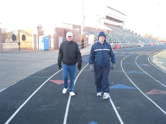 George Telle (L) and Dr. Keith Van Epps (R) begin lap 30 of 32 at Crater Stadium at Dover on a crisp January morning. Van Epps walks eight miles most weekdays and logged 1,775 miles in 2011. Photo by: Kyle Valentini.